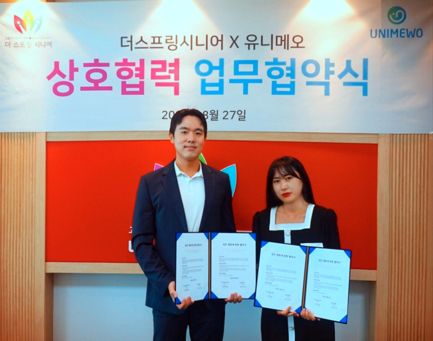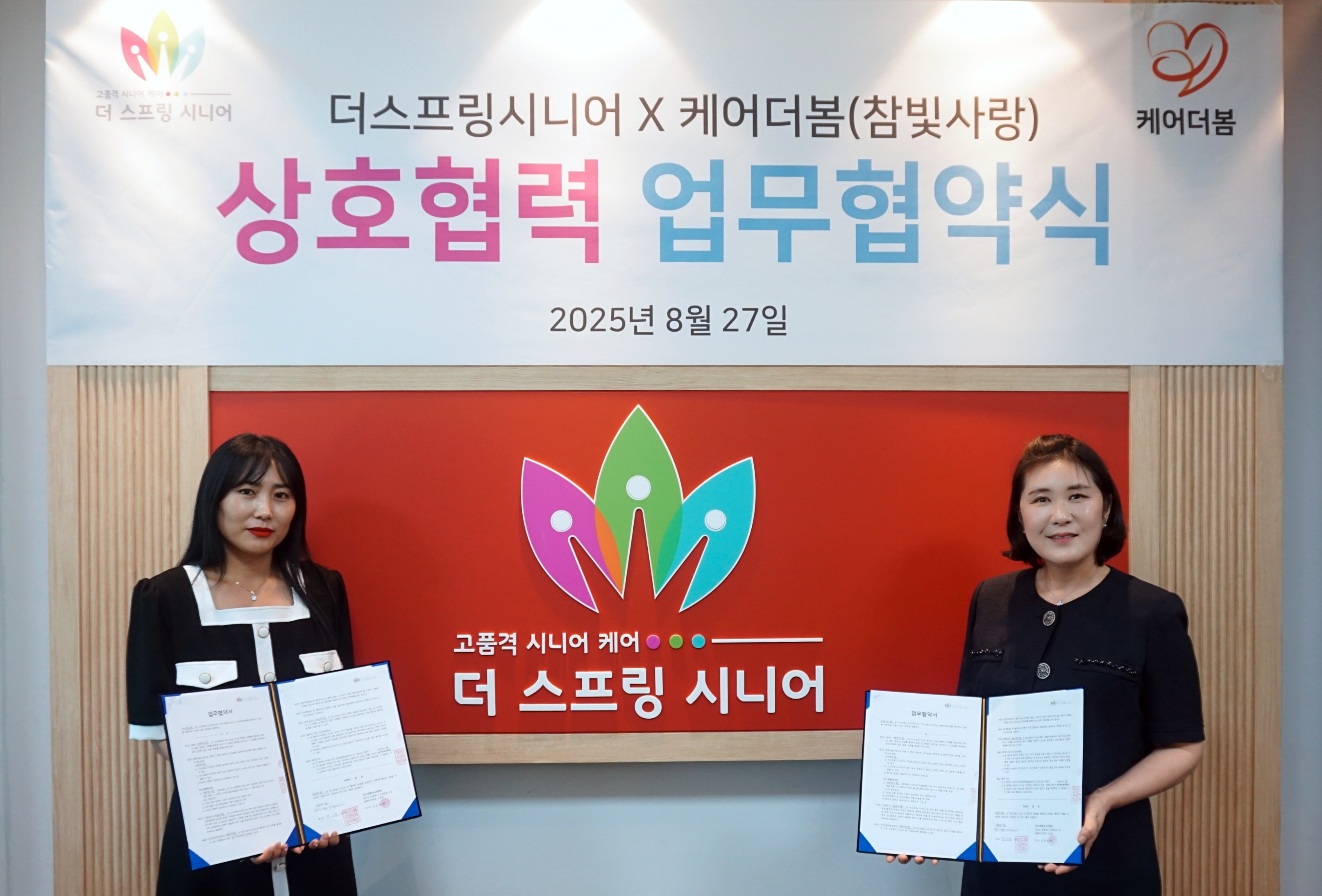 더스프링시니어, 전문 간병 서비스 기업들과 업무협약 체결케어 실버타운 더스프링시니어는입주 어르신들에게 한층 더 안정적이고 전문적인 돌봄 서비스를 제공하기 위해,간병인 매칭 플랫폼 ‘좋은케어’를 운영하는 ㈜유니메오와8월 27일 전략적 업무협약(MOU)을 체결했습니다.