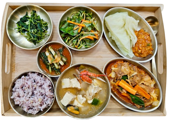 혼합잡곡밥 · 해물된장찌개 · 제육볶음 · 양배추쌈&쌈장 · 참나물무침 · 깻잎나물볶음 · 열무김치