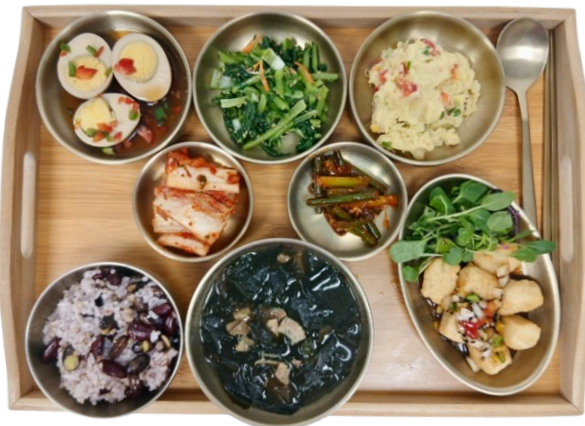 강낭콩밥 · 소고기미역국 · 두부가라아케 · 감자샐러드 · 계란장조림 · 시금치무침 · 마늘쫑무침 · 배추김치