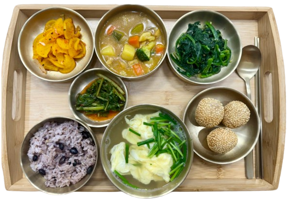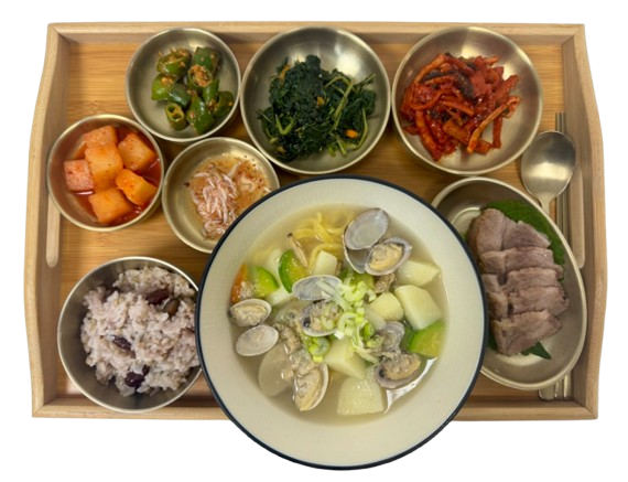 혼합잡곡밥 · 바지락단호박수제비 · 돈수육&새우젓 · 무말랭이무침 · 취나물무침 · 오이고추된장무침 · 깍두기