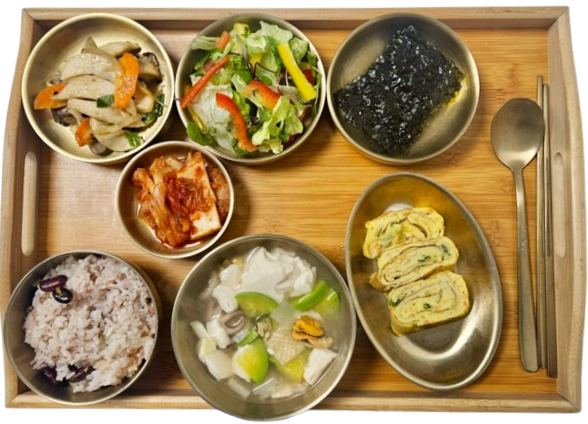 혼합잡곡밥 · 해물순두부국 · 계란말이 · 파프리카샐러드 · 새송이볶음 · 김구이 · 배추김치