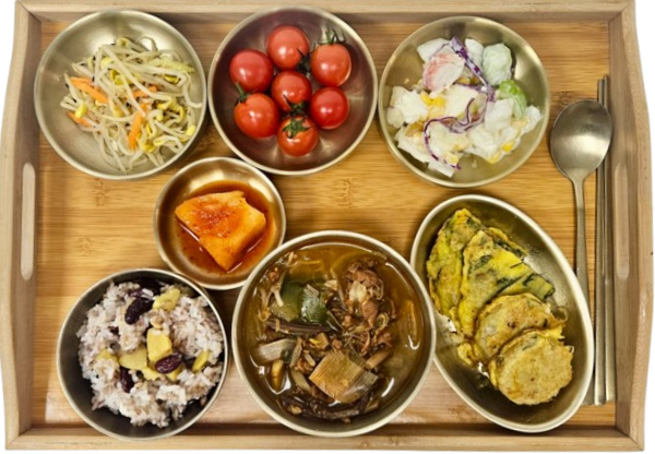 영양밤밥 · 육개장 · 모듬전(깻잎전·표고전) · 양배추콘샐러드 · 콩나물무침 · 석박지 · 방울토마토